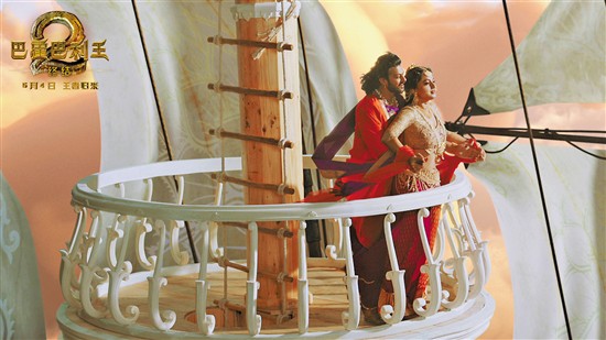 如此受人民愛戴的王,卻不愛江山愛美人,為了心愛的提婆犀那而放棄王位,更為了實(shí)現(xiàn)對愛人的承諾而陷入敵人的圈套。影片對于巴霍巴利王和提婆犀那之間的愛情也進(jìn)行了極致浪漫的渲染:二人組成雙箭CP,退敵過程中配合默契,動作優(yōu)美得仿佛在跳雙人舞;乘船離開時(shí),巴霍巴利王站在水里,一只手搭船舷一只手搭岸邊構(gòu)成“人肉橋”,讓提婆犀那踩著自己的肩膀登船;天鵝船飛到了空中,兩人在云端載歌載舞,還重現(xiàn)了《泰坦尼克號》的經(jīng)典pose;提婆犀那遭猥瑣官員陷害,得知官員企圖占自己妻子的便宜,巴霍巴利王二話不說一刀將其斃命,“誰敢動她先問問我的刀”……如此浪漫的“寵妻狂魔”,俘獲了不少觀眾的少女心。