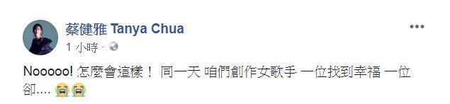 蔡健雅連續(xù)在臉書發(fā)了2篇文章悼念盧凱彤,“同一天,咱們創(chuàng)作女歌手,一位找到幸福,一位卻…”一天之內(nèi),先是收到徐佳瑩的喜訊,再得到盧凱彤墜樓身亡的噩耗,她沒有把話說完,想見心情相當(dāng)復(fù)雜,遲遲不敢置信好友已離開人世的消息。