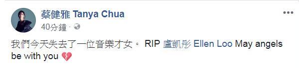 過了近半小時(shí)后,蔡健雅再度PO文:“我們今天失去了一位音樂才女!庇H自TAG盧凱彤的臉書帳號(hào),像是最后一次呼喚好友的名字,讓人看了不免鼻酸,“May angels be with you.(愿天使與你同在)”心碎的表情符號(hào)道盡心情,不少網(wǎng)友看了也在留言區(qū)默哀:“希望天堂真的是無憂無慮的地方”、“祝福一路好走,從此以后不再煩惱!