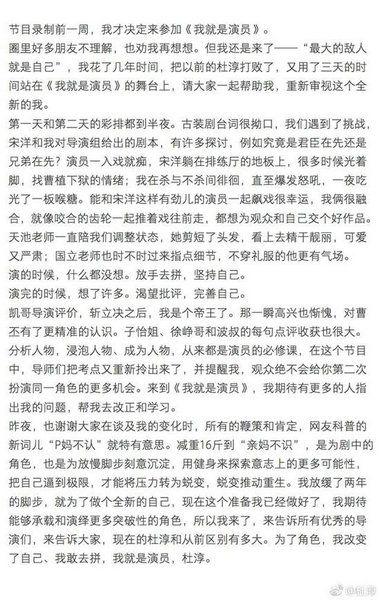 9月8日晚播出的《演員的誕生》第二季《我就是演員》中,有網(wǎng)友發(fā)現(xiàn)杜淳瘦了很多,紛紛表示認(rèn)不出,還大呼:“這真的是杜淳嗎?”隨后,該詞迅速登上熱搜榜第一。對(duì)此,杜淳昨晚就發(fā)微博回應(yīng)稱“確實(shí)是我”。今天上午,他又發(fā)長(zhǎng)文回應(yīng),稱被網(wǎng)友科普的新詞兒“P媽不認(rèn)”特有意思。他表示:“減重16斤到‘親媽不識(shí)’,是為劇中的角色,也是為放慢腳步刻意沉淀……我放緩了兩年的腳步,就為了做個(gè)全新的自己,現(xiàn)在這個(gè)準(zhǔn)備我已經(jīng)做好了,我期待能夠承載和演繹更多突破性的角色,所以我來了,來告訴所有優(yōu)秀的導(dǎo)演們,來告訴大家,現(xiàn)在的杜淳和從前區(qū)別有多大。”