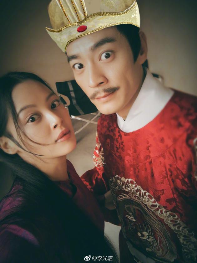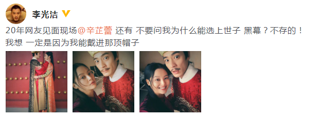 9月12日晚,李光潔通過微博曬和辛芷蕾合影,并調(diào)皮的寫道:“20年網(wǎng)友見面現(xiàn)場@辛芷蕾 ,還有,不要問我為什么能選上世子。黑幕?不存的!我想,一定是因為我能戴進那頂帽子!闭掌,李光潔和辛芷蕾依然是劇中的扮相,兩人深情對視,另外還有兩人對鏡瞪眼搞怪的,十分的可愛。