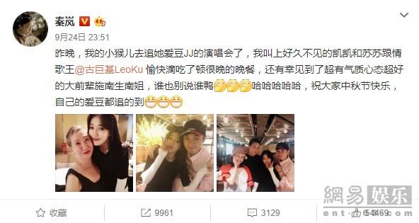 24日,秦嵐曬出與古巨基、施南生、許凱、蘇青合照,并稱:“昨晚,我的小猴兒去追她愛豆JJ的演唱會了,我叫上好久不見的凱凱和蘇蘇跟情歌王古巨基愉快滴吃了頓很晚的晚餐,還有幸見到了超有氣質(zhì)心態(tài)超好的大前輩施南生南姐,誰也別說誰鴨。哈哈哈哈哈,祝大家中秋節(jié)快樂,自己的愛豆都追的到!闭掌,秦嵐“左擁右抱”古巨基許凱陪伴在側(cè),“爾晴”蘇青站在“傅恒”許凱身旁,俊男美女也是十分登對。5AC安康新聞網(wǎng)