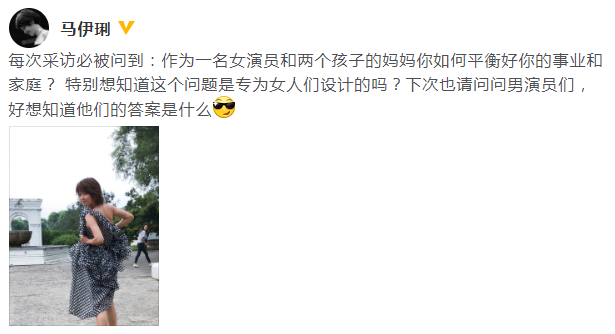馬伊琍發(fā)文調(diào)侃每次采訪都會被問如何平衡工作與家庭,并發(fā)問:“特別想知道這個問題是專為女人們設計的嗎?下次也請問問男演員們,好想知道他們的答案是什么!