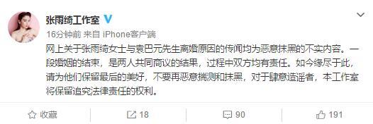 28日下午,張雨綺工作室就與袁巴元先生離婚原因發(fā)表聲明,稱:“網(wǎng)上關(guān)于張雨綺女士與袁巴元先生離婚原因的傳聞均為惡意抹黑的不實內(nèi)容。一段婚姻的結(jié)束,是兩人共同商議的結(jié)果,過程中雙方均有責(zé)任。如今緣盡于此,請為他們保留最后的美好,不要再惡意揣測和抹黑,對于肆意造謠者,本工作室將保留追究法律責(zé)任的權(quán)利!Qi6安康新聞網(wǎng)
