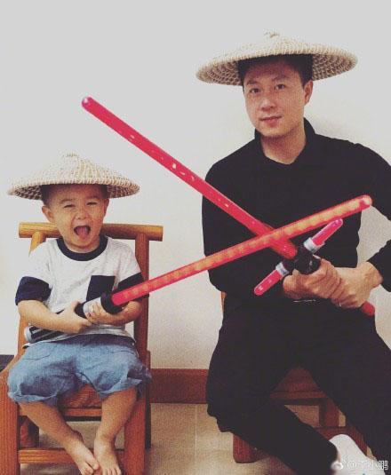 照片中的他與兒子坐在凳子上,拿著星球大戰(zhàn)的激光劍,戴著功夫熊貓的斗笠,父子倆現(xiàn)場(chǎng)PK,十分熱鬧。