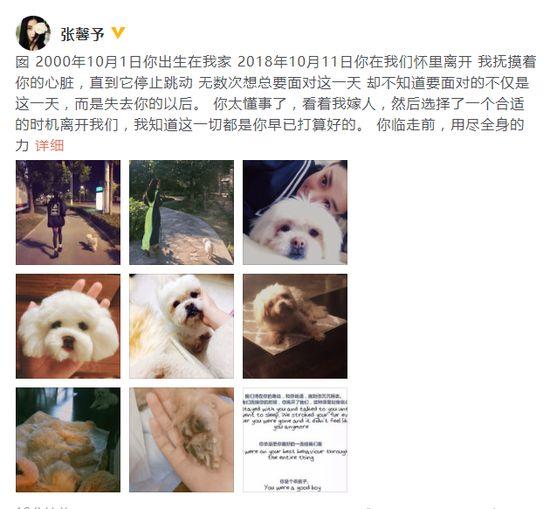 原標(biāo)題:張馨予發(fā)文悼念去世愛犬:謝謝你陪伴的18年