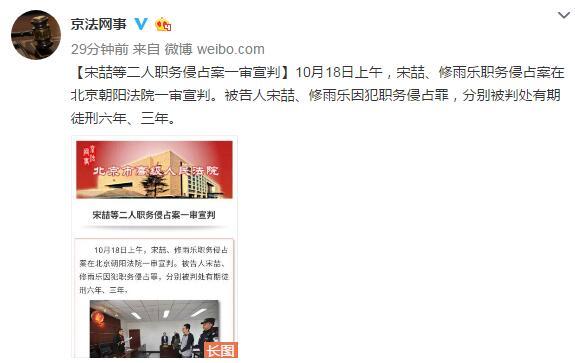 人民網(wǎng)北京10月18日電 據(jù)北京法院網(wǎng)官方微博消息,10月18日上午,宋喆、修雨樂(lè)職務(wù)侵占案在北京朝陽(yáng)法院一審宣判。被告人宋喆、修雨樂(lè)因犯職務(wù)侵占罪,分別被判處有期徒刑六年、三年。