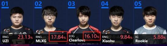 今天就要截止的all stars投票結(jié)果基本已經(jīng)塵埃落定,RNG的UZI遙遙領(lǐng)先,得票率高達(dá)23.13%,第二名的同樣是來(lái)自RNG的MLXG,得票率也有17.84%,第三名是廠長(zhǎng),得票率為16.10%。IG最靠前的Rookie也只排在了第五位,得票率5.88%。
