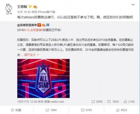 《英雄聯(lián)盟》2018Allstar投票于上周開(kāi)啟,即將于10月23日也就是今天截止,不過(guò)在投票馬上就截止的時(shí)候,王思聰突然在微博上發(fā)聲,轉(zhuǎn)發(fā)了英雄聯(lián)盟賽事投票開(kāi)啟的微博,怒懟了一下網(wǎng)友和投票結(jié)果。 “每次allstars投票就這德行,iG以后還是就不參與了吧。嗯,瘋狂投你們的同胞吧”