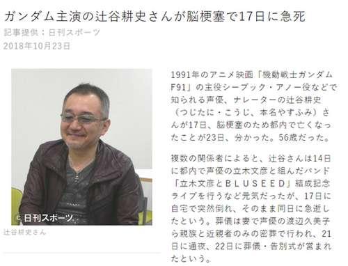 據(jù)日本媒體報(bào)道,《灌籃高手》藤真健司、《犬夜叉》彌勒、《三只眼》藤井八云、《機(jī)動(dòng)戰(zhàn)士高達(dá)F91》西布克·亞諾等眾多角色的聲優(yōu)辻谷耕史因腦梗塞去世,享年56歲。