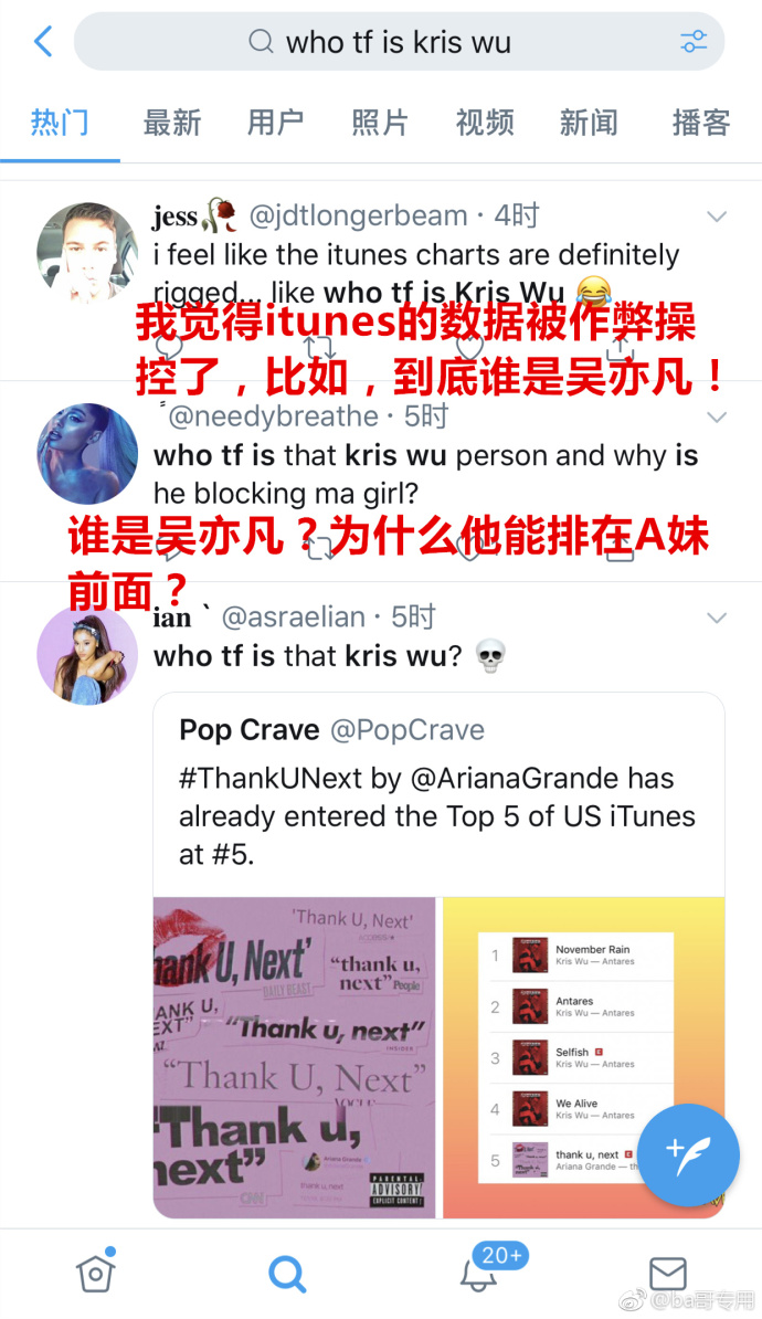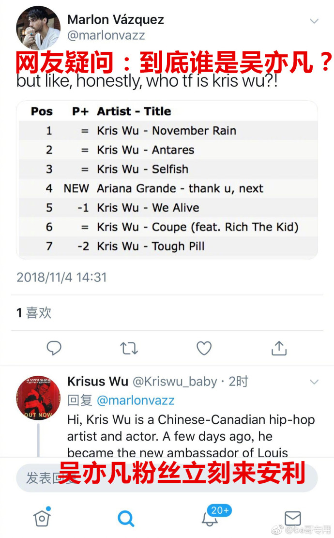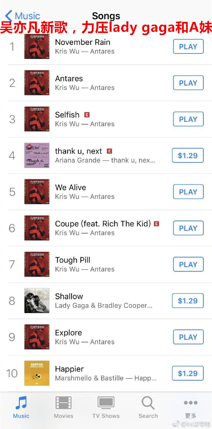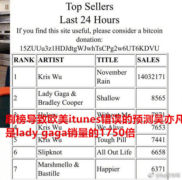 近日,吳亦凡發(fā)行新單曲,在歐美iTunes榜單上力壓Lady Gaga和A妹,前十的榜單上更是占據(jù)七席,不過此番“屠榜”引來(lái)眾多國(guó)外網(wǎng)友的質(zhì)疑,表示不認(rèn)識(shí)吳亦凡,也不理解為何新單的排名可以這么高。此前,由于吳亦凡粉絲集中刷榜,導(dǎo)致音樂榜單系統(tǒng)預(yù)算吳亦凡的銷量是Lady Gaga的1750倍 ,十分驚人。XTX安康新聞網(wǎng)