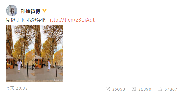 11月4日,孫怡在自己微博曬出美照,并配文稱:“街挺美的,我挺冷的!闭掌械乃驹诖蠼稚,街上的樹葉金黃,秋景十分動(dòng)人。她身穿白色睡衣,腳踩酒店拖鞋,漫步街頭,十分有趣。MsB安康新聞網(wǎng)