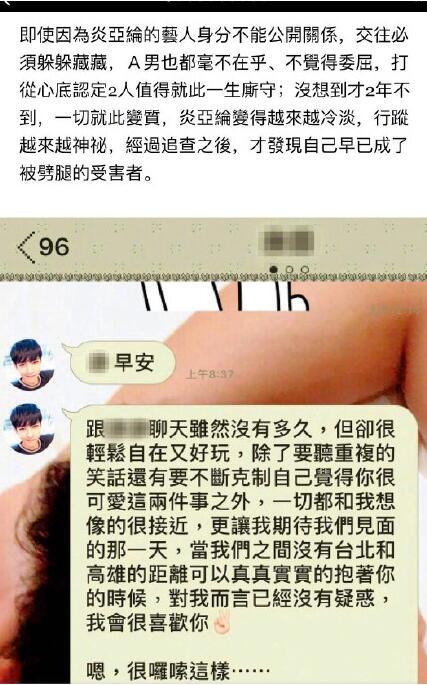 當(dāng)中受害者集體接連爆料,流出一連串的男男接吻照以及對話截圖,截圖中炎亞綸更提及,“你想分手就分手吧”以及“你好好的過你自己的生活!”證明兩人的交往關(guān)系。