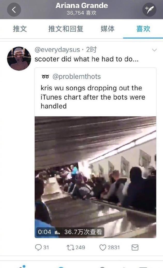 11月4日,美國知名歌手“A妹”愛莉安娜·格蘭德發(fā)行新歌,然而北美榜單的榜首卻始終被吳亦凡“霸占”,令不少A妹的粉絲表示不解,也引得不少國外網(wǎng)友紛紛詢問“who is Kris Wu?”隨后,有消息稱歌手A妹的經(jīng)紀人Scooter Braun發(fā)推,疑似指責吳亦凡刷榜,從而引發(fā)國內(nèi)外網(wǎng)友的關(guān)注和熱議。