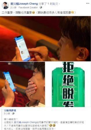 鄭元暢在轉(zhuǎn)發(fā)的貼文中搞笑地說,聽說最近有不少人有諸如此類的困擾,似乎是指有人為了頭發(fā)多寡所擾,他不忘溫馨提醒:“工作重要,頭發(fā)也很重要。”