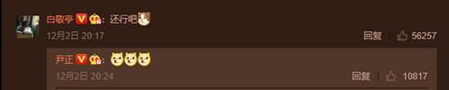 12月2日晚,尹正在自己微博曬出一段視頻,曬出自己的球鞋。隨后,白敬亭在評論區(qū)留言:“還行吧!辈⑴渖弦粋貓咪表情,尹正回以狗頭表情,兩人互動十分搞笑。gZC安康新聞網