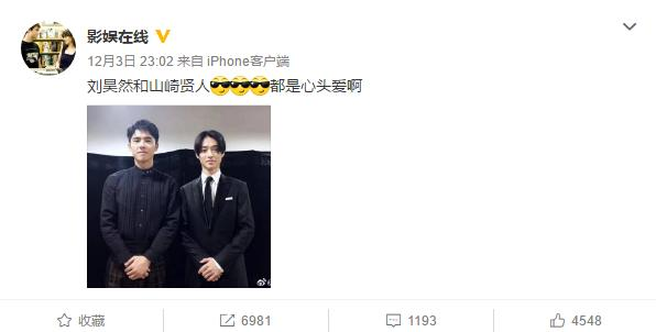 12月3日,某娛樂賬號(hào)曬出了一張劉昊然和山崎賢人的合影,引得網(wǎng)友感慨:“次元壁已被敲碎1