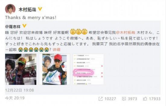 12月22日,木村拓哉開通微博,身為頭號(hào)迷弟的羅志祥發(fā)文表白愛豆。12月24日,木村拓哉轉(zhuǎn)發(fā)羅志祥的微博,稱:“感謝,圣誕快樂1vJd安康新聞網(wǎng)