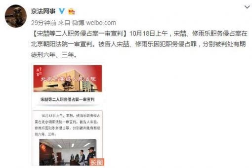 據(jù)北京法院網(wǎng)官方微博 @京法網(wǎng)事 10月18日消息,10月18日上午,宋喆、修雨樂職務(wù)侵占案在北京朝陽法院一審宣判。被告人宋喆、修雨樂因犯職務(wù)侵占罪,分別被判處……