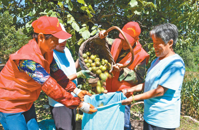 圖為隊(duì)員們將采收的核桃裝進(jìn)袋子。