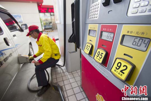 資料圖:山西太原,加油站工作人員給車輛加油。 中新社記者 張?jiān)?攝