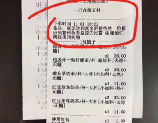 民警四處詢(xún)問(wèn)了下,沒(méi)人下過(guò)單,快遞小哥連忙遞上手中的外賣(mài)單,上面寫(xiě)著:麻煩送到派出所接待處,給值班民警和負(fù)責(zé)監(jiān)控的民警,謝謝他們幫我找回失物。