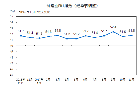 人民網(wǎng)北京11月30日電 據(jù)國(guó)家統(tǒng)計(jì)局網(wǎng)站消息,2017年11月份,中國(guó)制造業(yè)采購(gòu)經(jīng)理指數(shù)(PMI)為51.8%,比上月上升0.2個(gè)百分點(diǎn),制造業(yè)繼續(xù)保持穩(wěn)中有升的發(fā)展態(tài)勢(shì)。