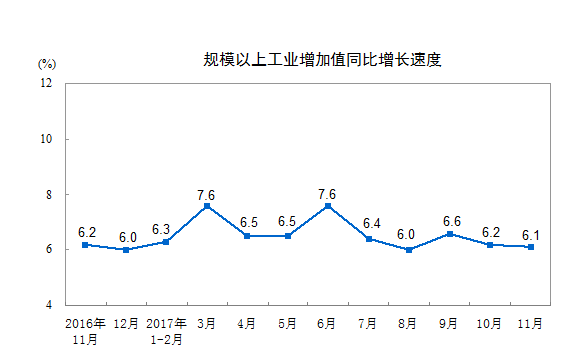 人民網(wǎng)北京12月14日電(記者李楠樺)據(jù)國(guó)家統(tǒng)計(jì)局官方網(wǎng)站消息,2017年11月份,規(guī)模以上工業(yè)增加值同比實(shí)際增長(zhǎng)6.1%(以下增加值增速均為扣除價(jià)格因素的實(shí)際增長(zhǎng)率),比10月份回落0.1個(gè)百分點(diǎn)。從環(huán)比看,11月份,規(guī)模以上工業(yè)增加值比上月增長(zhǎng)0.48%。1-11月份,規(guī)模以上工業(yè)增加值同比增長(zhǎng)6.6%。