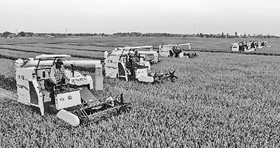 江蘇省興化市國家糧食生產(chǎn)功能區(qū)智慧農(nóng)業(yè)服務(wù)中心糧食產(chǎn)業(yè)園收割水稻的繁忙景象。湯德宏攝/光明圖片