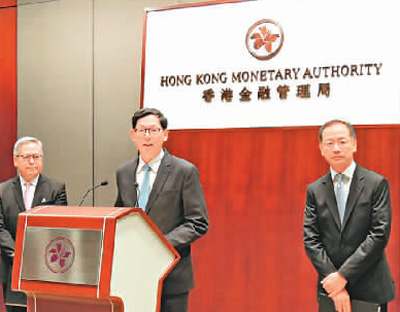 | 香港金融管理局總裁陳德霖(中)在介紹外匯基金投資回報情況。 |