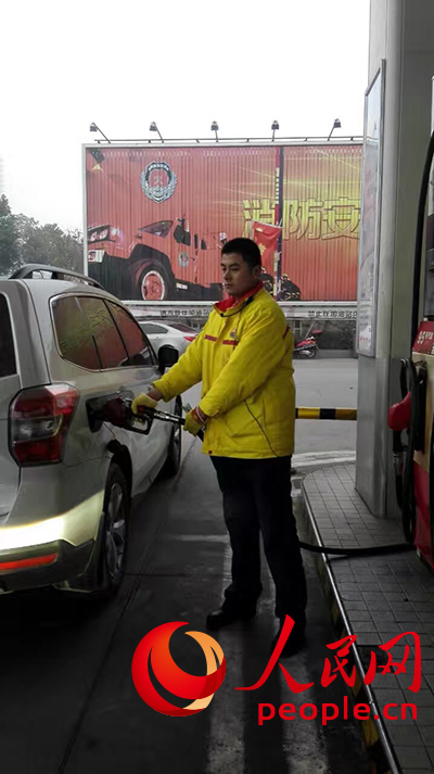 中國(guó)石油陜西安康銷售分公司三橋加油站工作人員正在給私家車加油。(人民網(wǎng) 朱江 拍攝)