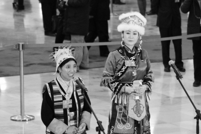 藏族代表卓嘎(左)與赫哲族代表劉蕾在“代表通道”接受中外媒體記者采訪。