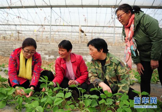 楊育英(左一)在自家果蔬大棚內(nèi)與員工交流育苗技術(shù)(3月20日攝),F(xiàn)年45歲的楊育英早前并不從事農(nóng)業(yè)。她19歲開始到北京打工,先是做推銷員,后來專門從事設(shè)施農(nóng)業(yè)設(shè)備的生產(chǎn)?吹皆O(shè)施農(nóng)業(yè)前景廣闊,她2008年帶著技術(shù)和資金回到陜西渭南老家,搞起了葡萄種植。建大棚、配設(shè)施、引苗木,很快她就建起了渭南裕美現(xiàn)代農(nóng)業(yè)設(shè)施示范園,并先后引進了36個葡萄品種。問起成功的秘訣,她坦言得益于她的“朋友圈”。新華社發(fā)(張博文 攝)