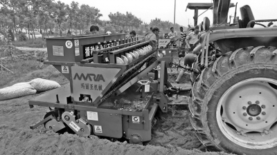 “這一播種機(jī),是由山東農(nóng)業(yè)大學(xué)和瑪麗亞機(jī)械農(nóng)機(jī)等企業(yè)歷時5年聯(lián)合研制的。通過田間播種效果看,基本上正芽率都在90%以上,非常符合我們山東對大蒜種植農(nóng)藝的要求!表n永平說,“使用智能大蒜精量播種機(jī)每天可播種大蒜50多畝,相當(dāng)于200多個人的工作量,打破了傳統(tǒng)大蒜播種不能直立、種植效率低的局面,為大蒜機(jī)械化、規(guī);、標(biāo)準(zhǔn)化種植奠定了堅實的基礎(chǔ)!