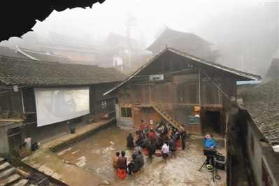 | 在南康侗寨的一戶村民家門(mén)口,有一塊大約半個(gè)籃球場(chǎng)大的曬谷場(chǎng)空地,肖錦生取出長(zhǎng)繩往門(mén)楣上掛去,然后拉直、打結(jié)、綁緊,不到十分鐘,一張大銀幕掛了起來(lái)。在確定電影機(jī)位后,他嫻熟地架起放映機(jī),接電源、調(diào)試音響,認(rèn)真地操作著每一個(gè)環(huán)節(jié)。 |