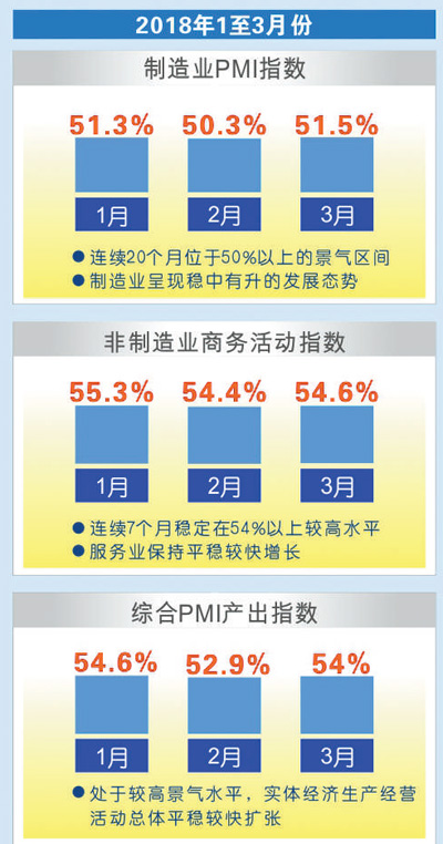 今年以來,面對(duì)錯(cuò)綜復(fù)雜的國(guó)際國(guó)內(nèi)環(huán)境,各地區(qū)各部門認(rèn)真貫徹黨中央決策部署,堅(jiān)持穩(wěn)中求進(jìn)工作總基調(diào),不斷深化改革開放,有效激發(fā)內(nèi)生動(dòng)力和活力。從作為先行指標(biāo)的1—3月份采購(gòu)經(jīng)理指數(shù)看,中國(guó)經(jīng)濟(jì)延續(xù)了去年以來穩(wěn)中向好發(fā)展態(tài)勢(shì),發(fā)展預(yù)期穩(wěn)定向好。