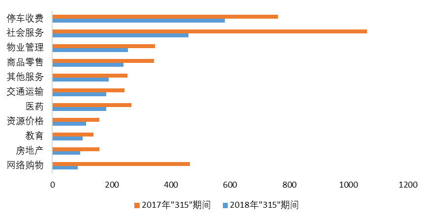 從熱點行業(yè)分布來看,“3·15”期間停車收費、社會服務(wù)、物業(yè)管理、商品零售等行業(yè)位居前列;與2017年同期相比,網(wǎng)絡(luò)購物、社會服務(wù)和房地產(chǎn)等行業(yè)受理量下降幅度較大。