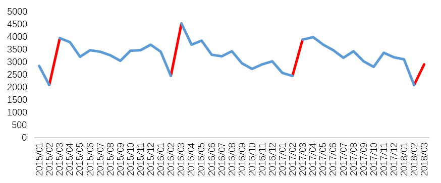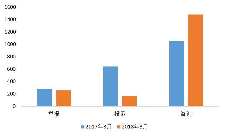 報告顯示,2018年3月平臺共受理價格舉報、投訴、咨詢共計 51432件,環(huán)比上升12.9%,同比下降40.5%,主要是由于網(wǎng)購行業(yè)舉報受理量同比下降85%。其中,價格舉報6941件,環(huán)比上升20%;價格投訴5091件,環(huán)比上升0.4%;價格咨詢39400件,環(huán)比上升13.5%。