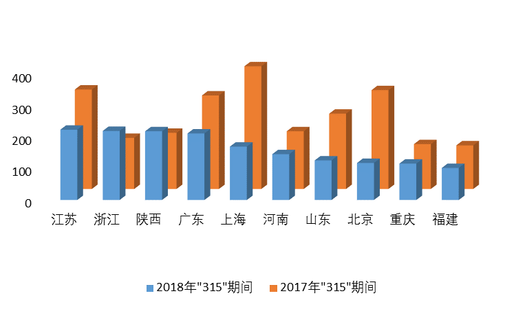 從地區(qū)受理量來看,和近兩年“3·15”期間平臺受理數(shù)據(jù)對比發(fā)現(xiàn),江蘇、上海、北京和廣東等地受理量均較去年同期下降明顯,浙江、陜西、河北和四川等地受理量均較去年有所增長。