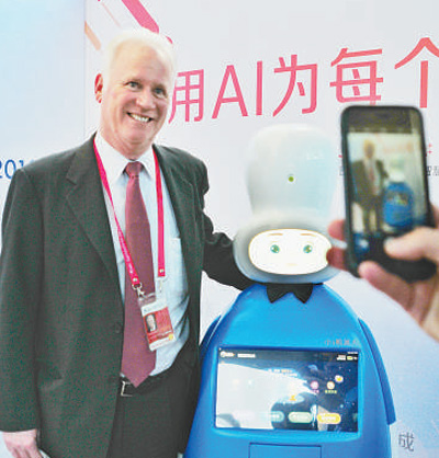 | 4月9日,清潔能源論壇首席執(zhí)行官薄銳思在體驗互動后與小i機器人合影。 |