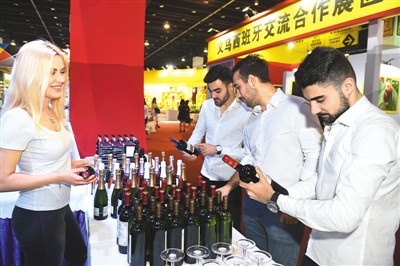 5月6日,2018中國義烏進(jìn)口商品博覽會在義烏國際博覽中心開幕。展會為境外中小企業(yè)源頭產(chǎn)品進(jìn)入國內(nèi)市場創(chuàng)造良好的貿(mào)易契機(jī)。圖為阿塞拜疆客商在挑選西班牙紅酒。 |