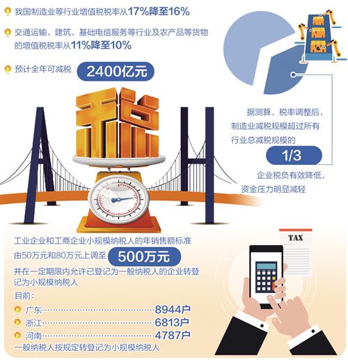 從5月1日起,我國制造業(yè)等行業(yè)增值稅稅率從17%降至16%,交通運輸、建筑、基礎電信服務等行業(yè)及農產品等貨物的增值稅稅率從11%降至10%,預計全年可減稅2400億元。