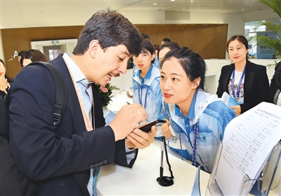 本次峰會(huì)志愿者服裝設(shè)計(jì)采用靈動(dòng)的海浪線條為主元素,因此,志愿者們被親切地稱為“小浪花”,構(gòu)成了黃海之濱一道亮眼風(fēng)景線。圖為6月6日,一名來(lái)自塔吉克斯坦的記者在新聞中心問(wèn)詢臺(tái)向志愿者咨詢。 |