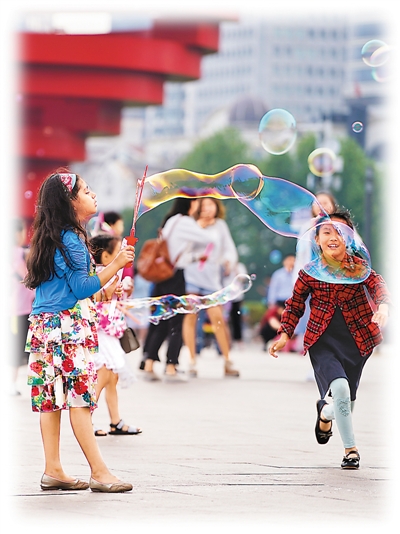 來(lái)自印度的小朋友雷特·梅赫塔(左)在青島五四廣場(chǎng)和中國(guó)小伙伴一起做游戲。 |