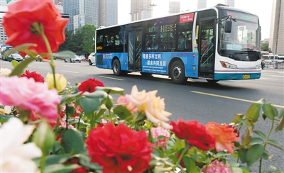 帶有上合峰會(huì)標(biāo)識(shí)的公交車行駛在青島街頭。 |