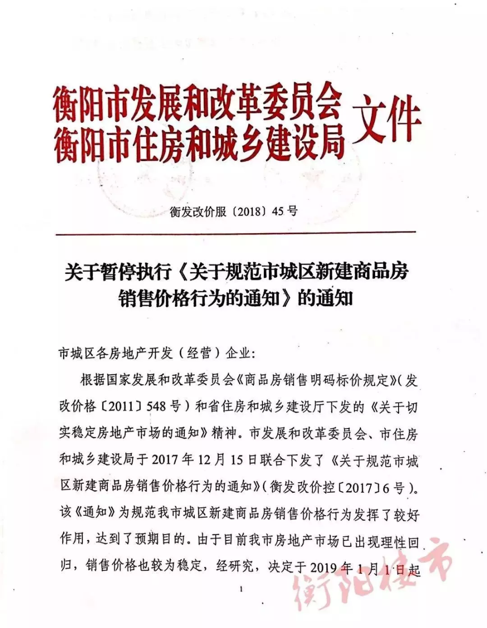 衡陽樓市微信公眾號(hào)26日公布衡陽發(fā)改委和住建局聯(lián)合下發(fā)的一份文件,自2019年1月1日起暫停執(zhí)行此前的商品房限價(jià)政策。