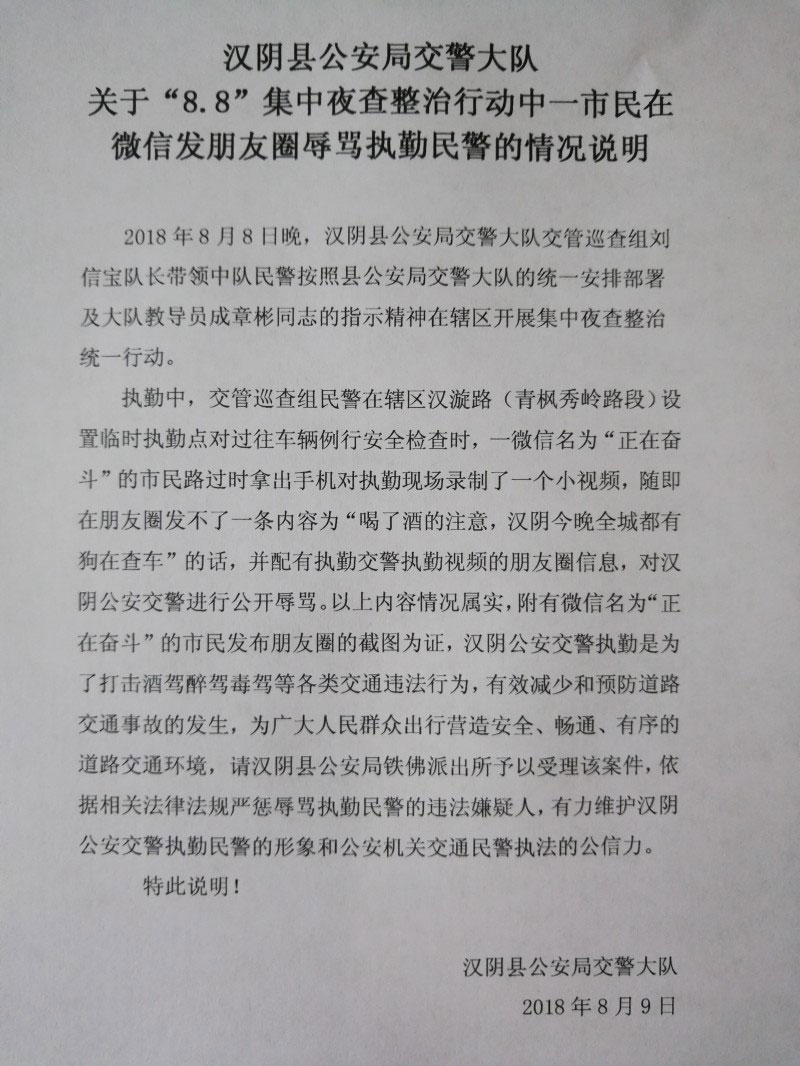 8月8日晚,漢陰縣公安局鐵佛派出所民警接到網友舉報,稱有一名網名叫“正在奮斗”的網友在朋友圈發(fā)布內容為“喝了酒的注意,漢陰今晚全城都有狗查車”的辱警信息。接到報警后,鐵佛派出所民警立即開展行動,不到48小時,迅速查處一起尋釁滋事案件。經調查,微信網友“正在奮斗”的真名叫郭某全,1985年出生,住漢陰縣城關鎮(zhèn)某小區(qū),正是發(fā)布該辱警信息的違法行為人。