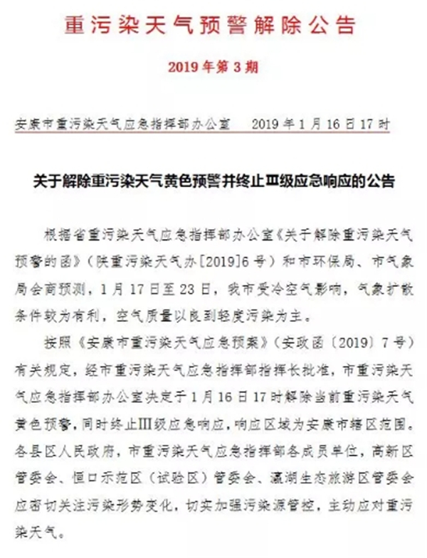 按照《安康市重污染天氣應(yīng)急預(yù)案》(安政函〔2019〕7號)有關(guān)規(guī)定,經(jīng)市重污染天氣應(yīng)急指揮部指揮長批準(zhǔn),市重污染天氣應(yīng)急指揮部辦公室決定于1月16日17時(shí)解除當(dāng)前重污染天氣黃色預(yù)警,同時(shí)終止Ⅲ級應(yīng)急響應(yīng),響應(yīng)區(qū)域?yàn)榘部凳休爡^(qū)范圍。各縣區(qū)人民政府,市重污染天氣應(yīng)急指揮部各成員單位,高新區(qū)管委會、恒口示范區(qū)(試驗(yàn)區(qū))管委會、瀛湖生態(tài)旅游區(qū)管委會應(yīng)密切關(guān)注污染形勢變化,切實(shí)加強(qiáng)污染源管控,主動(dòng)應(yīng)對重污染天氣。