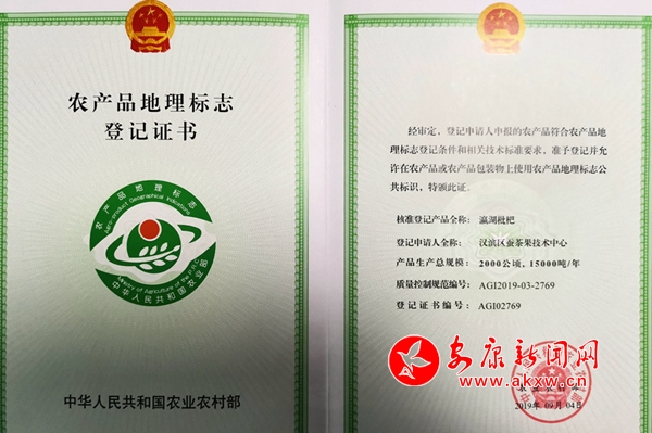 日前,農(nóng)業(yè)農(nóng)村部發(fā)布公告,漢濱區(qū)農(nóng)業(yè)農(nóng)村局蠶茶果技術(shù)中心申報(bào)的“瀛湖枇杷”經(jīng)過(guò)初審、專(zhuān)家評(píng)審和公示,符合農(nóng)產(chǎn)品地理標(biāo)志登記條件和相關(guān)技術(shù)標(biāo)準(zhǔn)要求,準(zhǔn)予登記,特頒發(fā)中華人民共和國(guó)農(nóng)產(chǎn)品地理標(biāo)志登記證書(shū)。