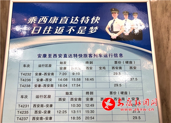 此次新增開的直達(dá)特快,從2020年1月10日起,安康至西安南每日開行3對,早上、中午、下午各1對,具體時刻為:T4232次安康早上7:20開、西安南9:10到;T4236次安康中午14:08開、西安南15:58到、西安16:45到;T4238次安康下午16:04開、西安南17:54到。在票價方面,本次直達(dá)特快安康至西安南間硬座票價29.50元,安康至西安間硬座票價37.50元。3對直達(dá)特快提供硬座、軟臥、硬臥不同席位,以滿足不同旅客出行需求。